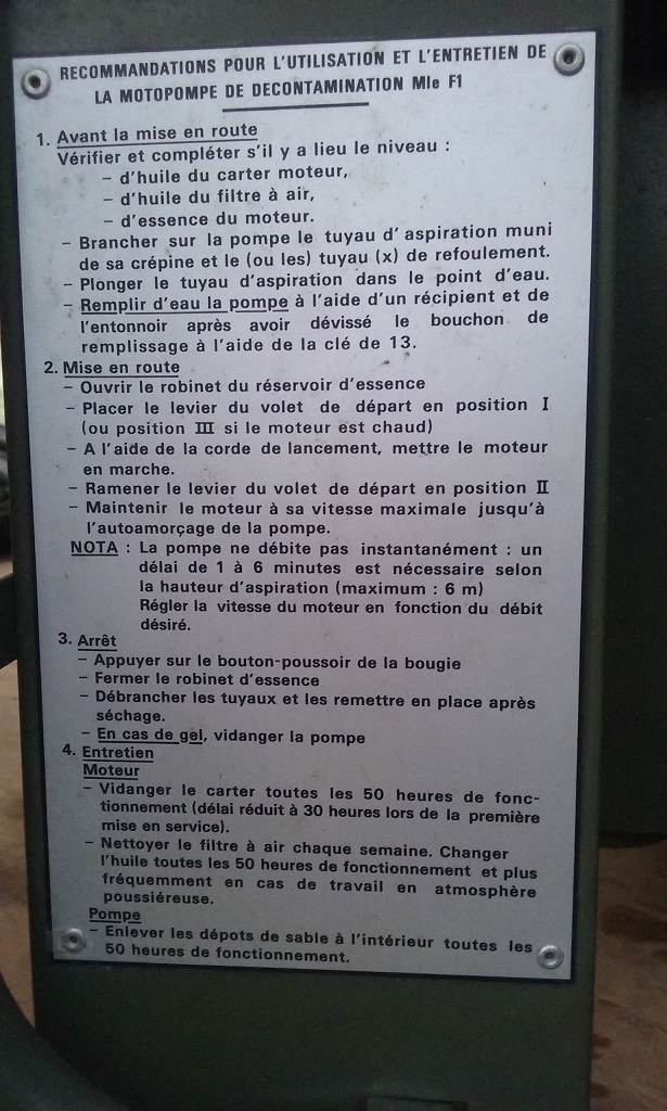 Présentation de la Moto-Pompe de décontamination F1, Armée Française :