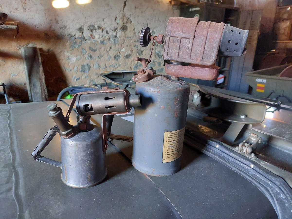 BMB Briggs Motor Bodies , le plus gros fabricant de jerrycan uk 1943 je pense qu'il était sable d'origine vu ce que je vois par endroit. Pour essayer de récupérer la couleur je tenterai la lessive de doude diluer dans de l'eau et après 20 a 30 min rinçage au karcher le vert devrait partir facilement ATTENTION DE METTRE DES GANTS C'EST COROSIF . La rondelles IV 46 est sa date d'arrivée dans le civil a dessouder délicatement